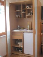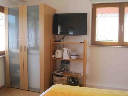 Im Zimmer befindet sich eine Miniküche im Schrank (2 Kochplatten, Kühlschrank, Spüle), Geschirr, Besteck, Wasserkocher, Toaster, Eierkocher, Kaffeemaschine und ein Esstisch. Darüber hinaus verfügen Sie über ein SAT-TV (Flachbildschirm) und WLAN.