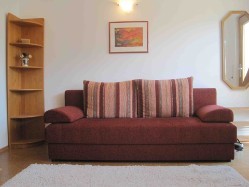 Das Appartement ist ausgestattet mit Dusche/WC, einem Doppelbett (200 x 160 cm) sowie mit einem ausklappbaren Sofa (140 cm). Im angrenzenden Nebenräumchen befinden sich zwei Schlafgelegenheiten (90 x 200 bzw. 80 x 200 cm).